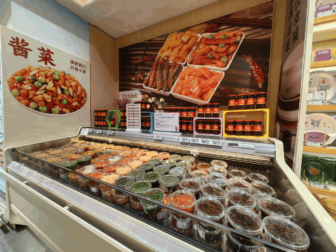 蛋品和榨菜也有專柜陳列,體現(xiàn)出了極強(qiáng)的品項(xiàng)組合能力。