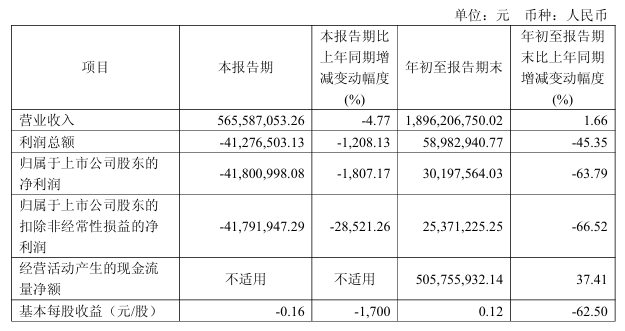 分季度來看,營收從一季度的6.92億元、二季度的6.38億元減少至三季度的5.66億元,增速明顯放慢。凈利潤則從5182.19萬元、2017.66萬元,轉(zhuǎn)為虧損4180.1萬元。