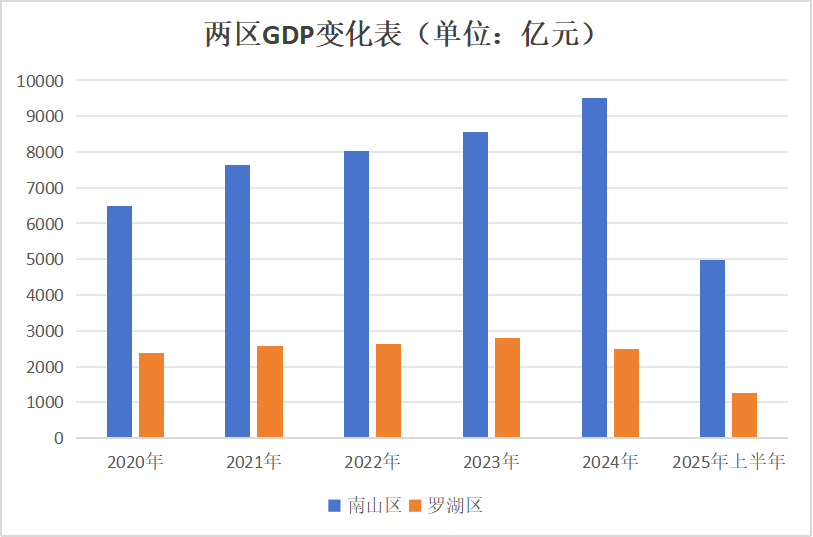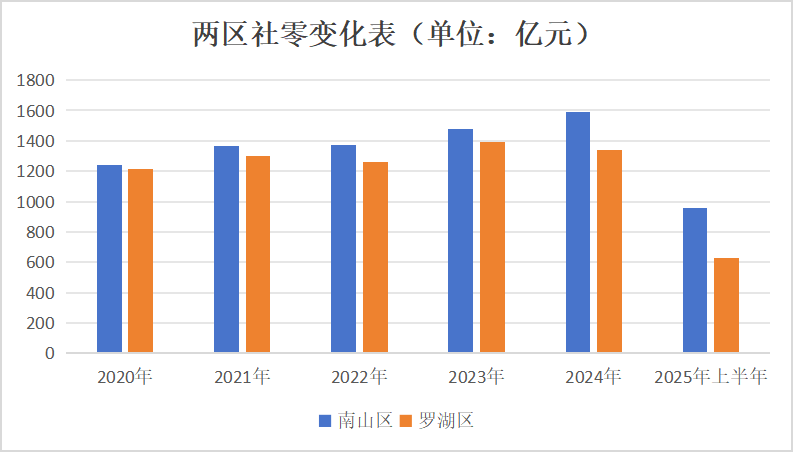 可以看到,2020年南山區(qū)與羅湖區(qū)的社會消費品零售總額相差不大,而到了2024年,兩區(qū)間的消費已經擴大到超200億元,按今年上半年的社零總額與增長幅度,2025年兩區(qū)間的消費差距將進一步擴大。