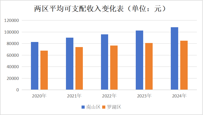 2020年至2024年,南山區(qū)居民人均可支配收入分別為82522元、90378元、95710元、102576元、108015元;同期,羅湖區(qū)居民人均可支配收入分別為67635元、73911元、76352元、80799元、85016元。