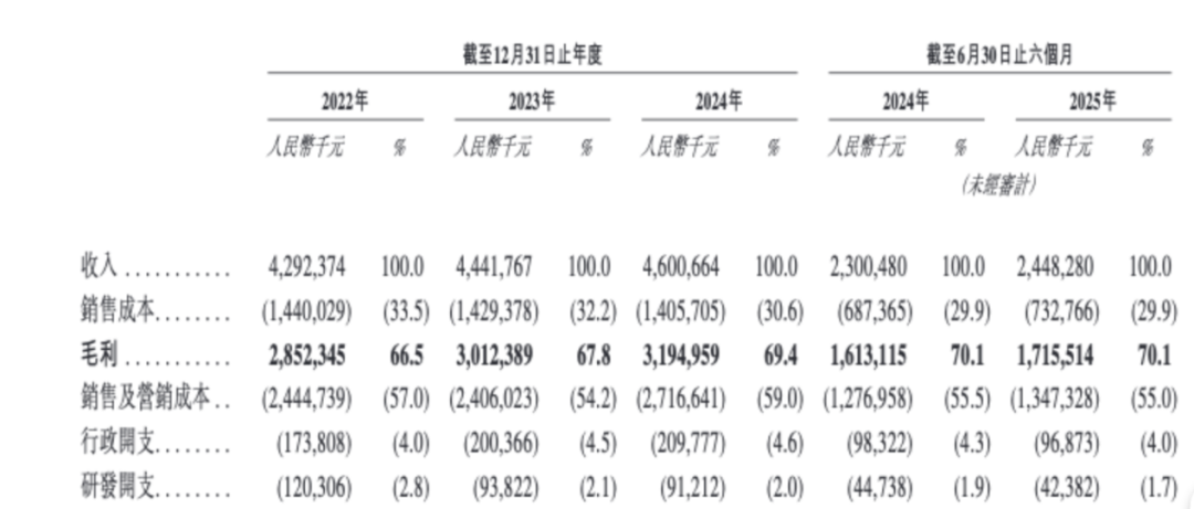 根據(jù)招股書,2022-2024年,自然堂的銷售及營(yíng)銷成本占其全年收入的比例分別約為57%、54.2%以及59%。同期,研發(fā)費(fèi)用率則是2.8%、2.1%、2.0%,呈現(xiàn)一個(gè)走低的趨勢(shì)。