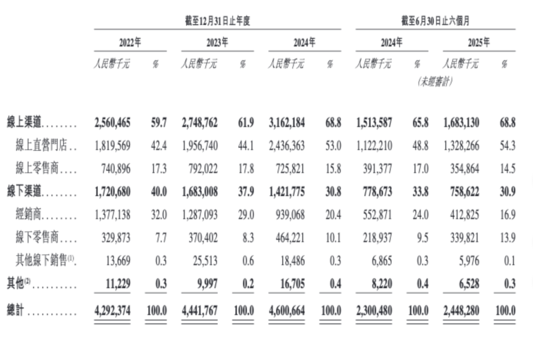 自然堂的線上、線下渠道的占比目前為70%和30%,較為均衡,但直營(yíng)體系的建設(shè)卻稍顯落后,2022-2024年線上自營(yíng)的占比從42.4%升至53%,2025年上半年為54.3%。
