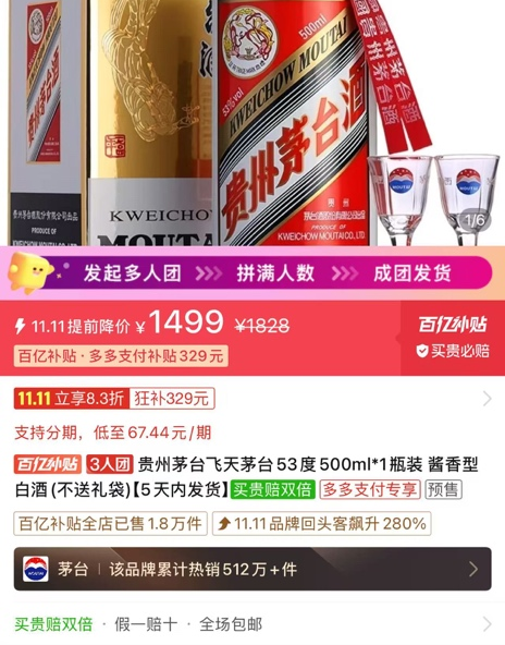 甚至在一些電商平臺,疊加補(bǔ)貼、團(tuán)購等各類優(yōu)惠后,飛天茅臺的單瓶售價已經(jīng)降到了1499元/瓶的官方零售價。