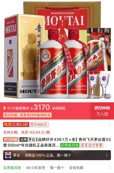 在部分電商平臺上,飛天茅臺的價格已跌破1600元/瓶,雙瓶裝的價格也低至3160元;1公斤規(guī)格的飛天茅臺更是下滑到2900元/瓶。