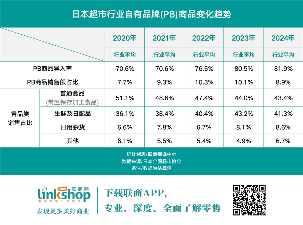 具體來看,近五年日本超市行業(yè)的PB商品呈現(xiàn)“覆蓋率提升、銷售比重趨穩(wěn)、結(jié)構(gòu)優(yōu)化”的趨勢(shì)。PB導(dǎo)入率從70.6%大幅上升至81.9%。不過,銷售額占比在2022年達(dá)到10.3%的峰值后有所回落,2024年降至8.9%,表明在激烈競(jìng)爭(zhēng)與通脹環(huán)境下,PB增長(zhǎng)遇到階段性瓶頸。