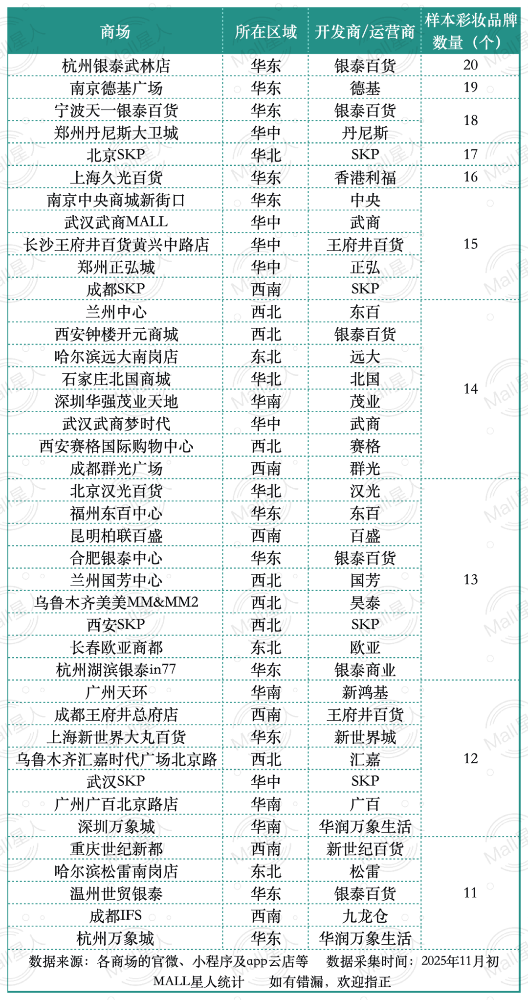 全國彩妝品牌最多的40家商場速覽(含23個樣本品牌數(shù)據的表格詳見文末)