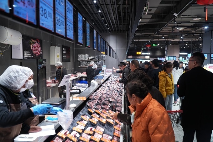 熟食區(qū)迎來全面升級,由專業(yè)廚師團隊打造多元風味,為日常餐桌提供豐富選擇。全新推出的熱鍋系列,包括龍蝦尾、蒲燒鰻魚等硬菜,以及現做涼拌葷菜、川味拌菜、撈汁海鮮和下酒菜系列,充分滿足家庭聚餐與日常佐餐需求。在深化供應鏈合作方面,門店既引入了本地特色供應商“豆記熟食”的臘牛肉、醬牛肉,還原地道陜西風味;又聯合東來供應商,帶來九多肉多特色豬蹄、雙匯網紅甜腸等口碑單品。針對年輕客群,還精心布局了正大烤雞系列、長安酥餅、韓式炸雞、周黑鴨、現烤披薩、現包餛飩與水餃、五彩涼皮等多樣化選擇,并搭配現做五谷飲品,構建起覆蓋早、中、晚三餐及休閑場景的完整美食矩陣。