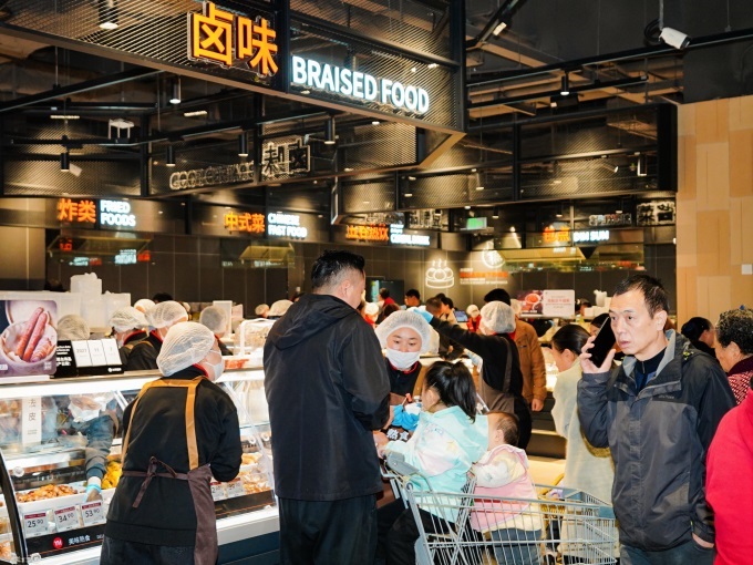 為增強(qiáng)賣場(chǎng)“煙火氣”,熟食與烘焙區(qū)域得到了重點(diǎn)強(qiáng)化。熟食板塊新增日邦壽司、雙匯熱鹵、九多肉多、豬堅(jiān)強(qiáng)等品牌,商品支數(shù)達(dá)到360支。其中,網(wǎng)紅商品“小甜腸”以其外酥里嫩、爆汁口感及多種烹飪適應(yīng)性受到關(guān)注;“國(guó)潮炸雞”強(qiáng)調(diào)現(xiàn)制現(xiàn)售與8小時(shí)腌制,主打外酥里嫩。此外,顧客還能在此買到胖東來同款的香辣豬蹄、秘鹵肉腸及韓式炸雞。