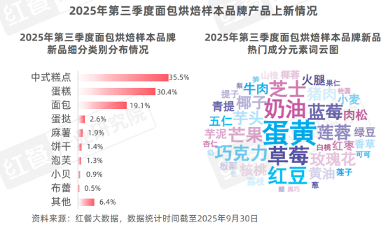 2025年第三季度,在紅餐產(chǎn)業(yè)研究院監(jiān)測(cè)的面包烘焙品牌中,有40個(gè)面包烘焙品牌共推出了1,025 款新品。從面包烘焙新品的細(xì)分種類(lèi)來(lái)看,中式糕點(diǎn)類(lèi)的新品數(shù)量最多,共推出了364款,占新品總數(shù)的35.5%。