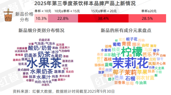 從價(jià)格分布來(lái)看,第三季度茶飲樣本品牌的新品單杯價(jià)格主要集中在15元≤單杯<20元和20元及以上這兩個(gè)區(qū)間內(nèi),占比分別為38.4%和28.5%。