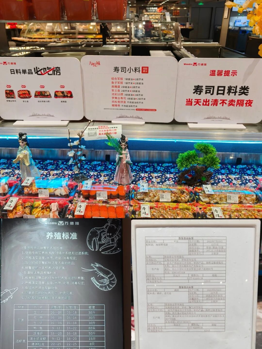 萬德隆也是如此,通過“可視化新鮮”與“標準化承諾”強化消費信任:壽司、面點、烤雞等區(qū)域明確標注“新鮮出爐,僅售一天”“本柜商品每天日清”;店內(nèi)包裝熟食均公示配料表、超市服務(wù)電話及市場監(jiān)督電話;水產(chǎn)區(qū)詳細列明養(yǎng)殖標準,包括不同品類的適宜溫度、鹽度及密度。