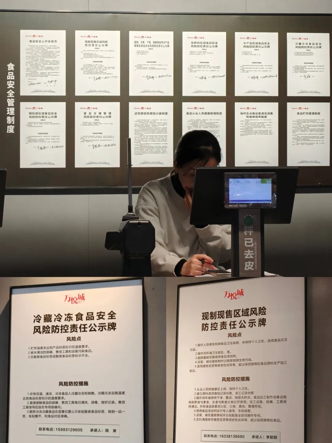 另外值得注意的是,萬德隆超市食品安全管控同樣嚴格。現(xiàn)制現(xiàn)售區(qū)域、冷藏冷凍食品區(qū)均張貼風(fēng)險防控責(zé)任公示牌,明確標注風(fēng)險點(如操作人員衛(wèi)生問題、食品存儲溫度不達標等)、防控措施,同時公示承諾人及聯(lián)系電話,實現(xiàn)責(zé)任可追溯;店內(nèi)還公示食品安全管理制度、進貨查驗記錄制度、從業(yè)人員健康管理制度等核心規(guī)范,強化消費信心。