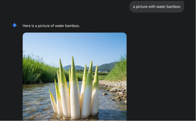 上文提到的神秘茭筍和神奇H?O分子,由于過于幽默,輿論擴(kuò)散后已經(jīng)被連夜撤下。但我還是不死心,茭筍這么神奇的新物種是怎么制造出來的?在我打算用Gemini復(fù)現(xiàn)一下這張AI圖時(shí),突然想起來,茭白是中國(guó)的本土物種,國(guó)外不常見,而茭白的英文翻譯是:water bamboo。于是我讓G老師幫我生成一張water bamboo的圖片, 一下子,我頓悟了,甚至感覺自己找到了山姆最愛的那條河。