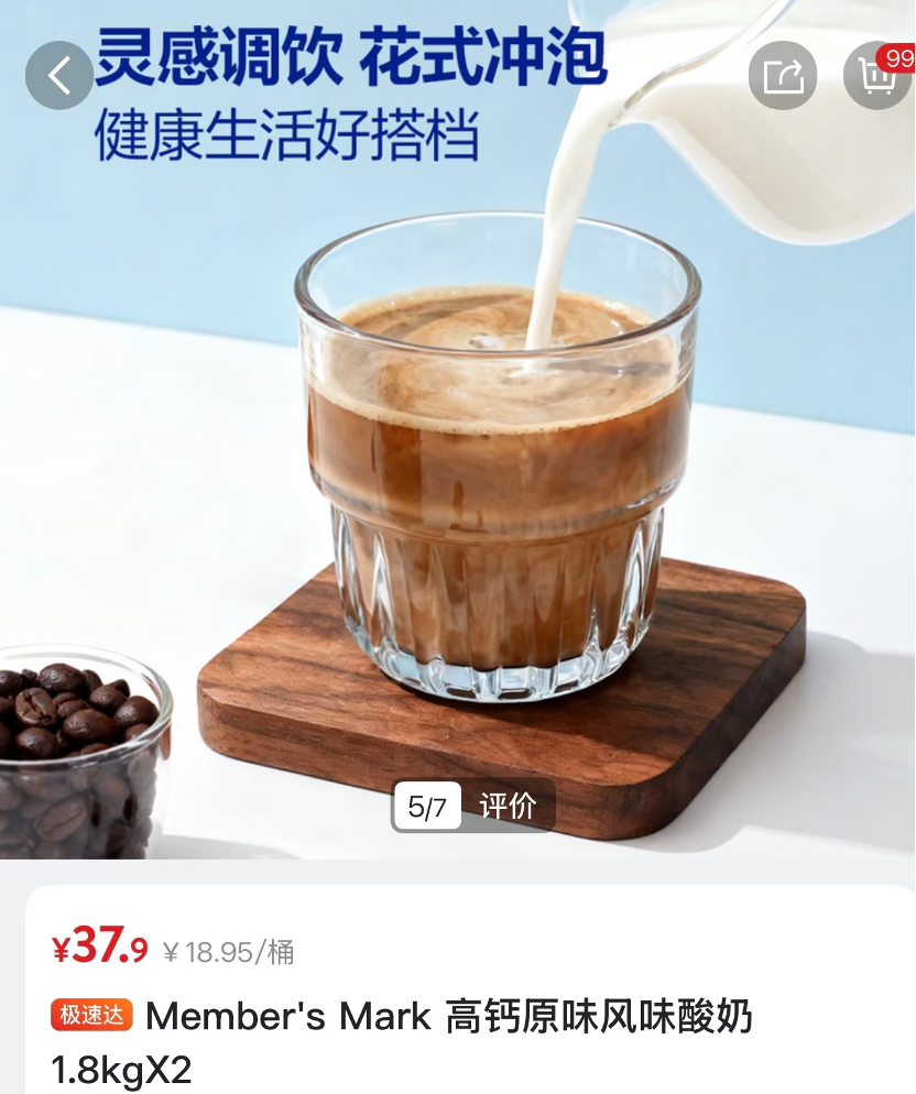 幽默的還有山姆高鈣原味風(fēng)味酸奶,配圖是往咖啡濃縮液里倒酸奶,邊上還貼心地放好一碗咖啡豆,生怕我認(rèn)不出那杯褐色液體是咖啡。圖上有兩行粗細(xì)不一的藍(lán)字,宣稱這是“靈感調(diào)飲花式?jīng)_泡健康生活好搭檔”,試圖用足夠大大大大大的字號(hào)完成對(duì)我的洗腦工作。