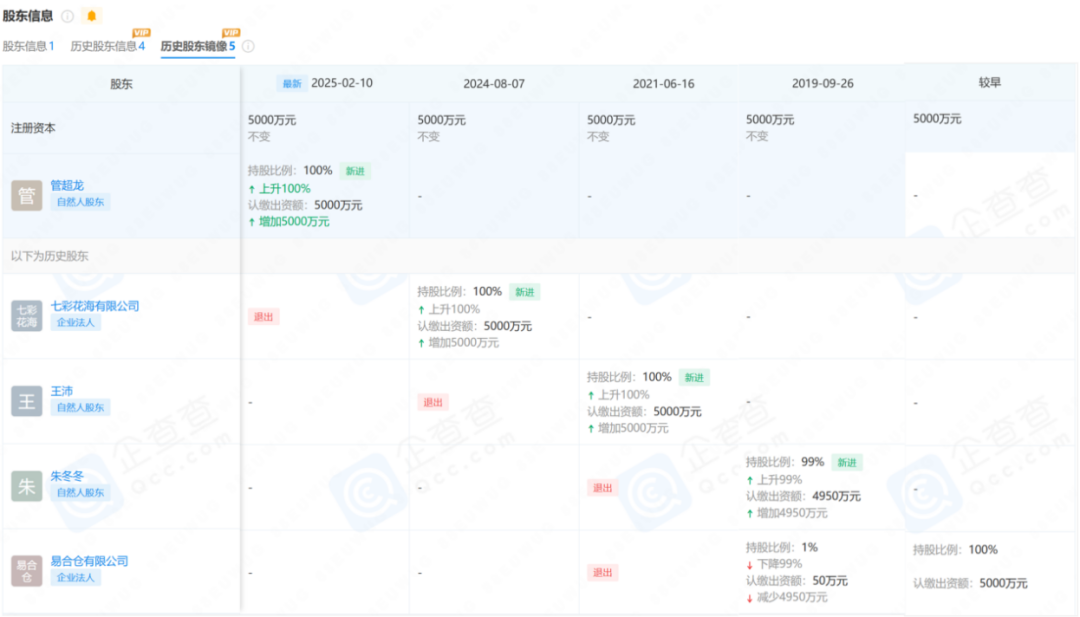 企查查數(shù)據(jù)顯示,易合倉(cāng)有限公司成立于2017年11月21日;而易合倉(cāng)超市有限公司成立于2019年9月26日,目前法定代表人為管超龍,其歷史股東鏡像顯示,易合倉(cāng)有限公司曾為易合倉(cāng)超市有限公司最早企業(yè)法人,后經(jīng)歷了一系列持股比例調(diào)整。