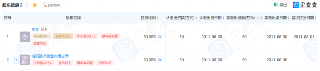 而李奕作為實(shí)際控制人、受益所有人持股50%的洛陽銀潤(rùn)物業(yè)管理有限公司,同樣面臨相關(guān)風(fēng)控。