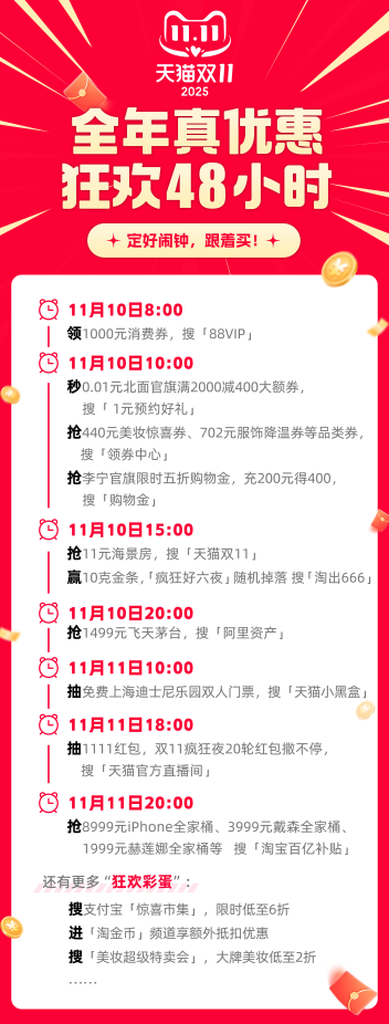 狂歡48小時(shí),定好的每個(gè)鬧鐘,都是最劃算的搶購時(shí)機(jī)!全年真優(yōu)惠的天貓雙11,現(xiàn)貨開賣至11月14日晚24點(diǎn)。
