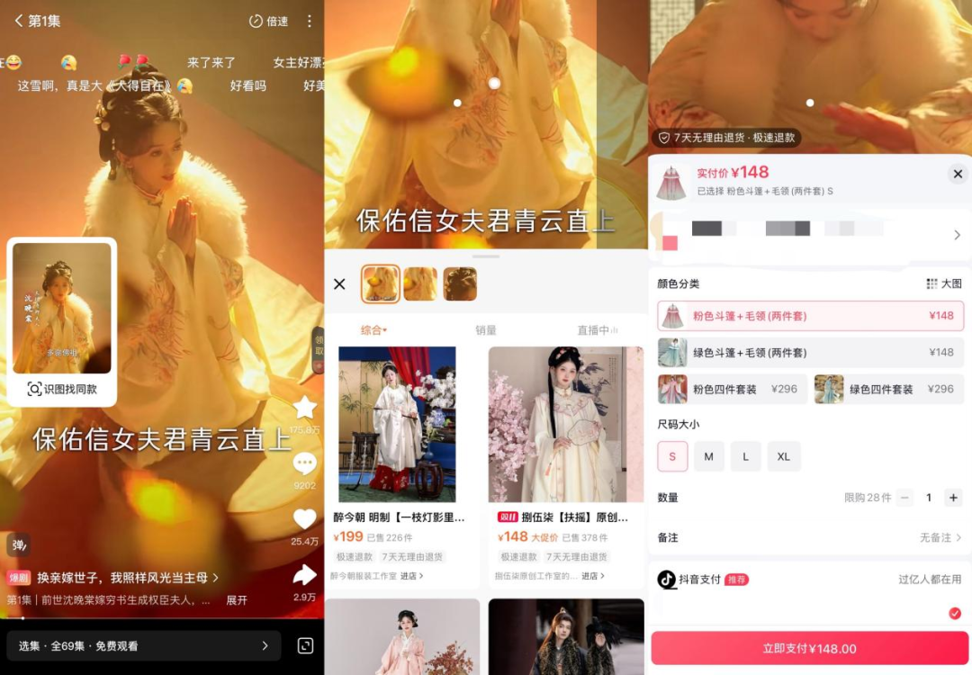 抖音的動作還要更快一些,此前就有消息爆出,與其同處字節(jié)跳動旗下的紅果短劇,正在小范圍測試帶貨功能,商品主要來自抖音電商品牌旗艦店,聚焦服飾、配飾等與短劇內容強相關的品類。