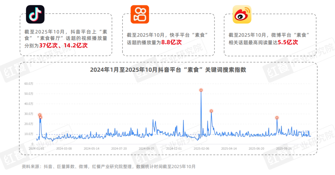 除了抖音平臺外,素食相關(guān)話題在其他媒體平臺的熱度也居高不下。截至2025年10月,快手平臺上“素食”話題播放量累計達8.8億次;微博平臺上“素食”相關(guān)話題最高閱讀量達5.5億次。