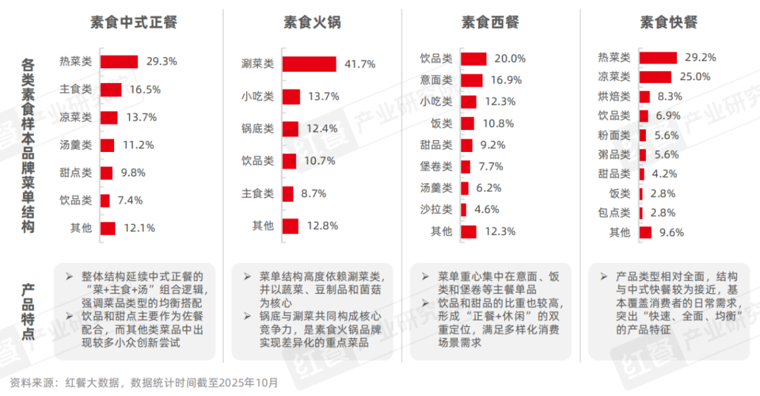 新派素食品牌的產(chǎn)品結(jié)構(gòu)呈現(xiàn)差異化邏輯。以中式素食正餐、素食火鍋、素食西餐、素食快餐為例,中式素食正餐注重均衡與傳統(tǒng)一體化,素食火鍋突出涮菜核心與鍋底創(chuàng)新,素食西餐強調(diào)“主餐+休閑”的復(fù)合定位,而素食快餐則以“快、全、均衡”為特征覆蓋多場景需求。