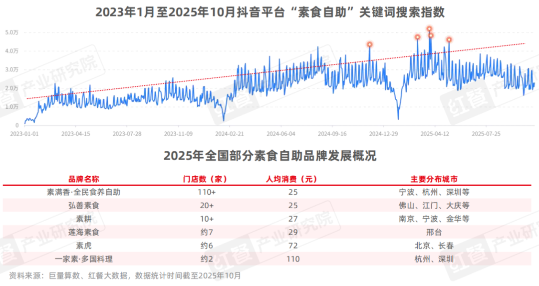近年來,隨著自助模式越來越受到市場青睞,素食自助也逐漸成了大眾關(guān)注的素食細分賽道。據(jù)巨量算數(shù),從2023年1月至2025年10月,抖音平臺“素食自助”搜索熱度整體呈上升趨勢。