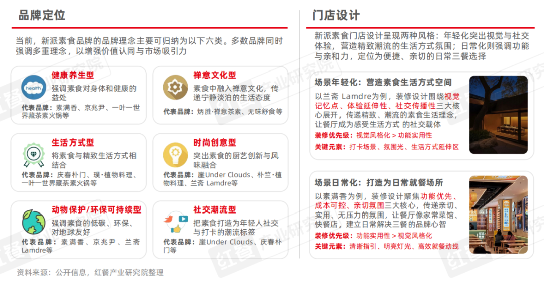 總體上看,與傳統(tǒng)素食品牌相比,新派素食品牌在理念上更突出健康、生活方式與美學(xué)屬性,通過現(xiàn)代化空間設(shè)計、社交媒體傳播以及貼合都市生活的消費場景,逐漸吸引年輕消費人群并淡化宗教色彩。本報告將以新派素食品牌作為主要研究對象。
