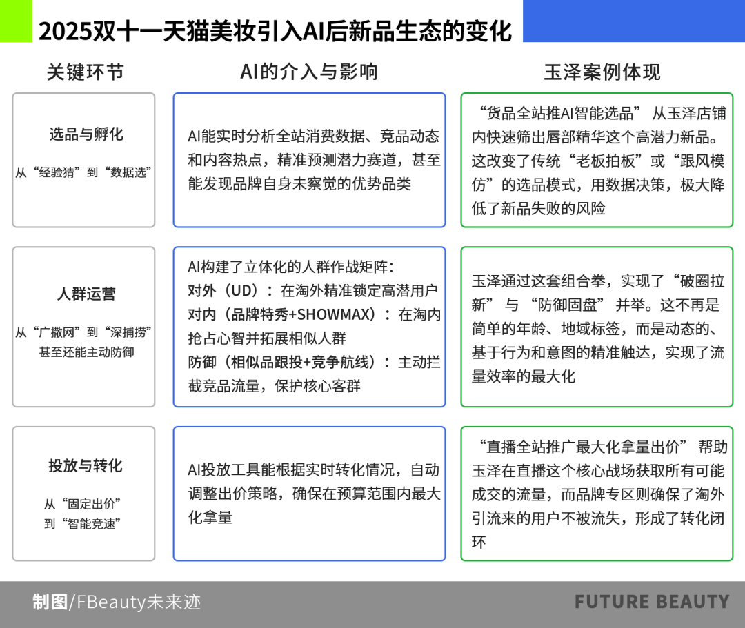 今年“雙11”,隨著天貓全面引入AI,《FBeauty未來跡》發(fā)現(xiàn),天貓美妝的新品生態(tài)也獲得了進一步升級。通過在“選品與孵化”“人群運營”和“投放與轉化”3個關鍵環(huán)節(jié)引入新工具,形成“鎖”“引”“接”“防”“追”的連招,為新品在“雙11”這種大型購物節(jié)中脫穎而出提供了抓手。
