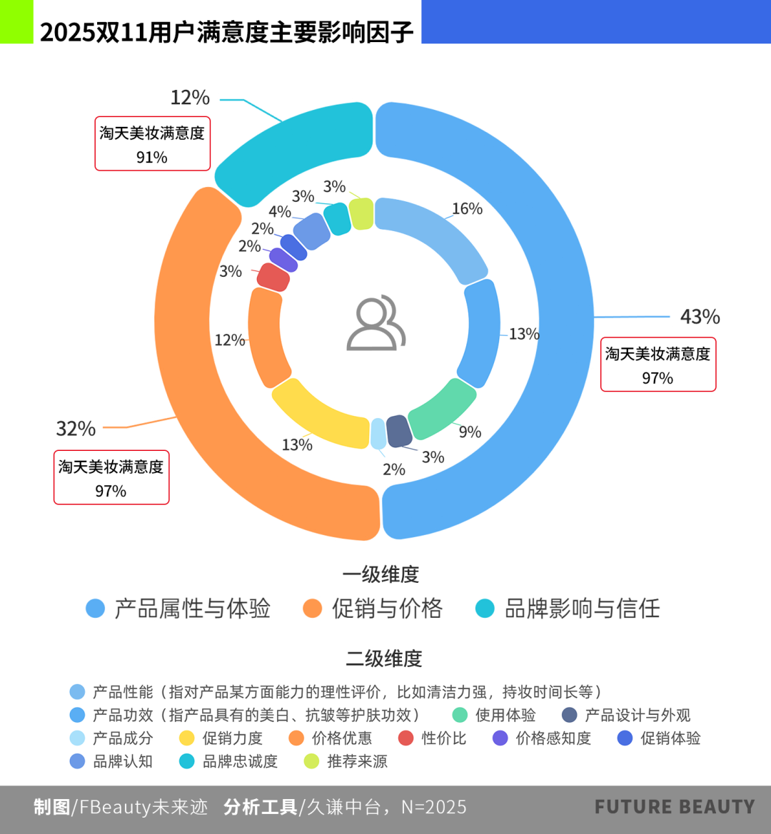 《FBeauty未來跡》通過社交媒體分析工具發(fā)現(xiàn),2025年,影響消費者對“雙11”滿意度的關鍵因子按權重排名,最大的已經不再是“促銷與價格”,而是產品屬性與體驗(43%)。
