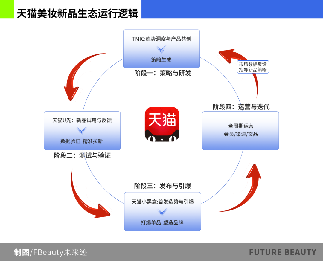 天貓的這套新品生態(tài)主要由“天貓新品創(chuàng)新中心(TMIC)、天貓U先、天貓小黑盒、天貓寶藏新品牌和天貓新品經營方法論”構成。強大之處在于它打造了一個從“市場機會洞察”到“產品開發(fā)測試”再到“市場發(fā)布引爆”,最終實現(xiàn)全周期運營的閉環(huán)。它通過TMIC的洞察能力降低研發(fā)的不確定性,通過天貓U先降低市場驗證的成本和風險,再通過天貓小黑盒解決初始流量難題,最后在天貓新品經營方法論的指導和天貓寶藏新品牌等計劃的扶持下,尋找從新品走向爆品的機會。