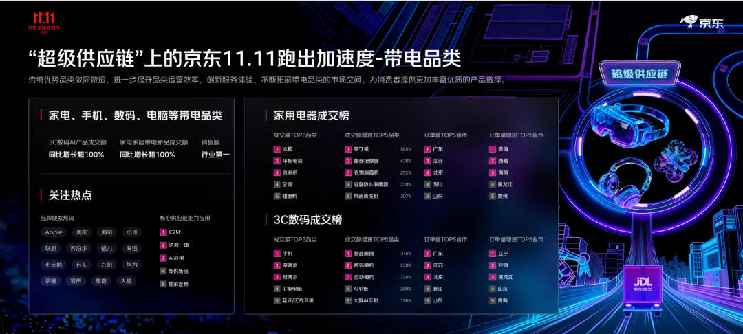 從品類來看,帶電品類持續(xù)領(lǐng)跑,手機(jī)新品成交額增長超4倍,AI平板、大屏AI手機(jī)增幅均超150%,家電家居閃電新品增長150%,送裝一體服務(wù)訂單量提升90%。