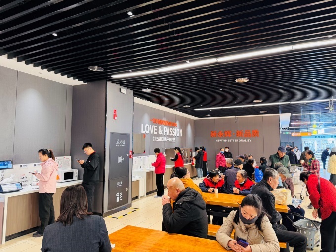 門(mén)店在環(huán)境與服務(wù)層面進(jìn)行了系統(tǒng)性革新。賣(mài)場(chǎng)取消強(qiáng)制動(dòng)線設(shè)計(jì),主通道大幅拓寬,貨架高度統(tǒng)一調(diào)整為1.6米,層數(shù)精簡(jiǎn)至5-6層,營(yíng)造出開(kāi)闊通透的購(gòu)物空間。豐富的試吃服務(wù)與配套桌椅,為消費(fèi)者提供“邊吃邊逛”的舒適體驗(yàn)。