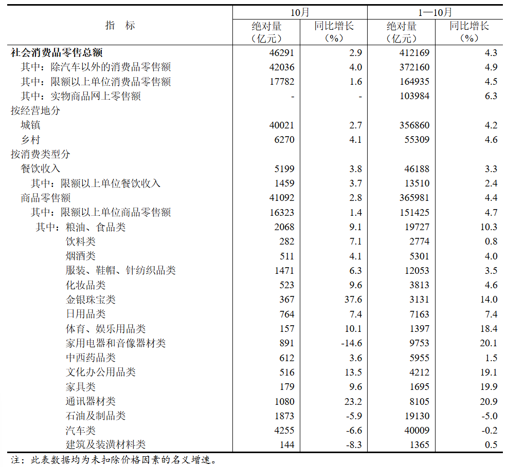 聯(lián)商快訊:11月14日,據(jù)國(guó)家統(tǒng)計(jì)局消息,10月份,社會(huì)消費(fèi)品零售總額46291億元,同比增長(zhǎng)2.9%。其中,除汽車(chē)以外的消費(fèi)品零售額42036億元,增長(zhǎng)4.0%。1-10月份,社會(huì)消費(fèi)品零售總額412169億元,增長(zhǎng)4.3%。其中,除汽車(chē)以外的消費(fèi)品零售額372160億元,增長(zhǎng)4.9%。