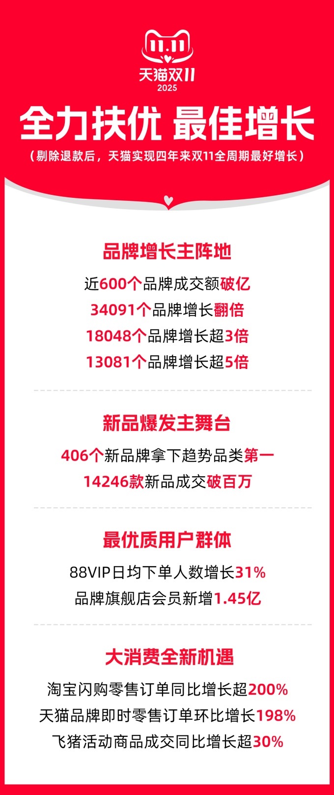 11月14日晚,2025年天貓雙11以實(shí)現(xiàn)四年來(lái)最好增長(zhǎng)收官。