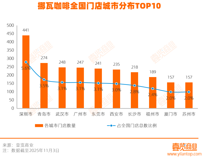 在普遍承壓的行業(yè)背景下,挪瓦咖啡門店規(guī)模逆勢(shì)增長(zhǎng)。該品牌成立于2019年,總部位于上海。2024年底,其創(chuàng)始人郭星君提出“2025年實(shí)現(xiàn)萬店”的目標(biāo)。這一目標(biāo)正快速推進(jìn)。壹覽商業(yè)數(shù)據(jù)顯示,截至2025年11月3日,挪瓦咖啡已在全國(guó)31個(gè)省份、266座城市開設(shè)7875家門店。相較于7月的3258家,挪瓦在四個(gè)月內(nèi)凈增4617家,規(guī)模翻番。