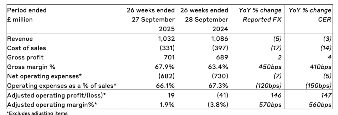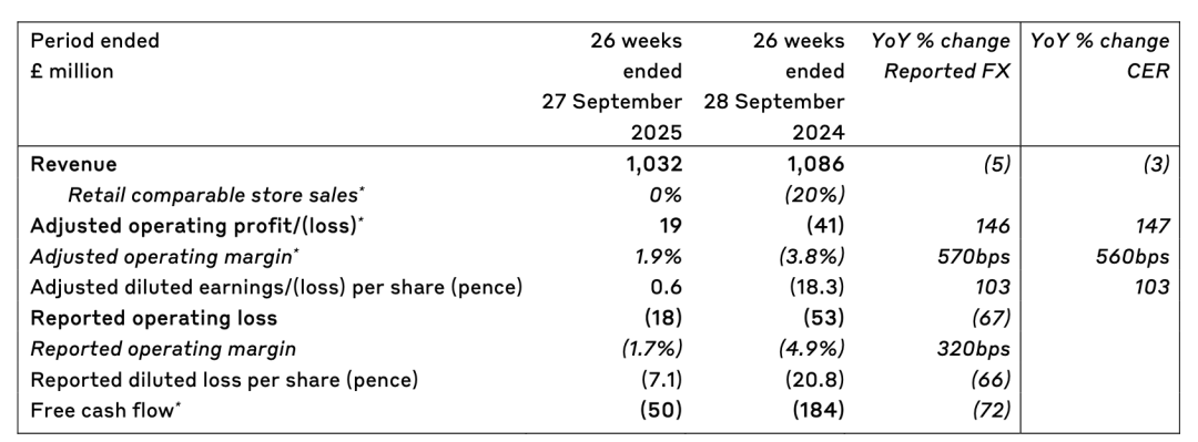 根據(jù)Burberry最新發(fā)布的財報,截至 2025 年9月27日的2026財年上半年,公司實現(xiàn)營收10.32億英鎊(約合人民幣96.51億元),按恒定匯率計算同比下降3%;營業(yè)虧損1800萬英鎊(約合人民幣1.68億元),相比去年同期的5300萬英鎊(約合人民幣4.96億元)虧損大幅度收窄。