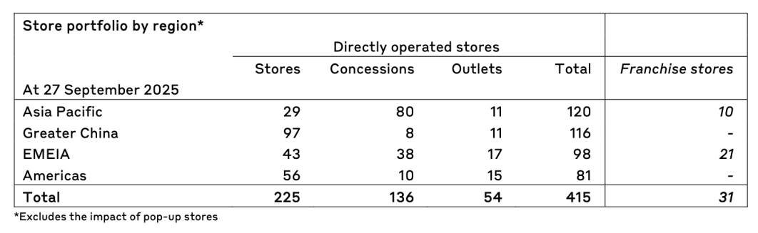 財報顯示,截至今年9月27日,Burberry新開4家門店,關(guān)閉11家,目前全球直營門店共有415家,Burberry奧萊門店為54家,報告期內(nèi)并未發(fā)生增減。