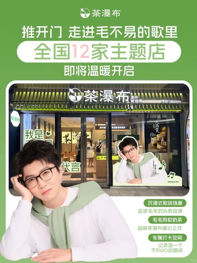 和普通門店相比,茶瀑布這12家主題店主打溫暖治愈。門店內(nèi)不僅能沉浸式體驗毛不易歌曲打造的治愈場景,品嘗特調(diào)的毛不易同款奶茶,店內(nèi)還設(shè)有專屬打卡區(qū),方便消費者定格快樂瞬間。