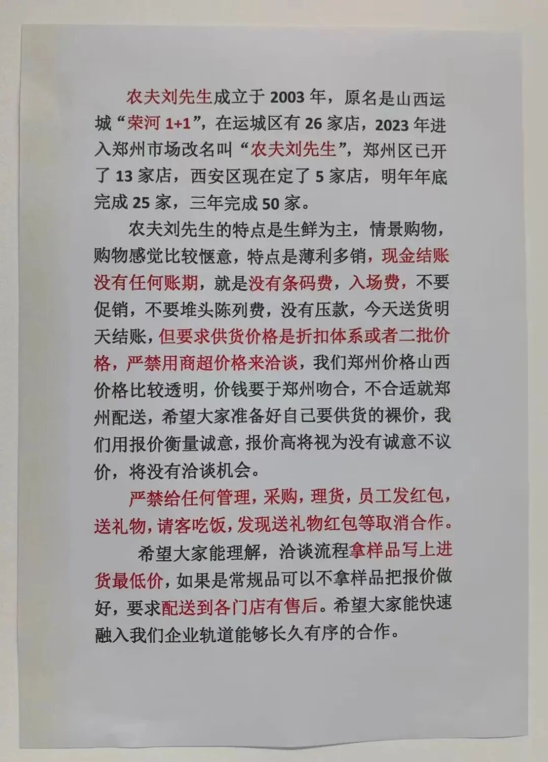 在辦公室,我們清晰地看到張貼在墻上的“簡介”:從開第一家小賣鋪開始,農(nóng)夫劉先生超市的特點是薄利多銷,現(xiàn)金結(jié)賬,沒有任何賬期,就是沒有條碼費,入場費,不要促銷,不要推頭陳列費,沒有壓款,今天送貨明天結(jié)賬,但要求供貨價是折扣體系或者二批價格,嚴禁用商超價格來洽談。嚴禁給任何管理,采購,理貨,員工發(fā)紅包,送禮物,請客吃飯,發(fā)現(xiàn)送禮物紅包等取消合作。嚴禁找關(guān)系找領(lǐng)導(dǎo)打招呼,所有托關(guān)系的商品取消洽談資格!