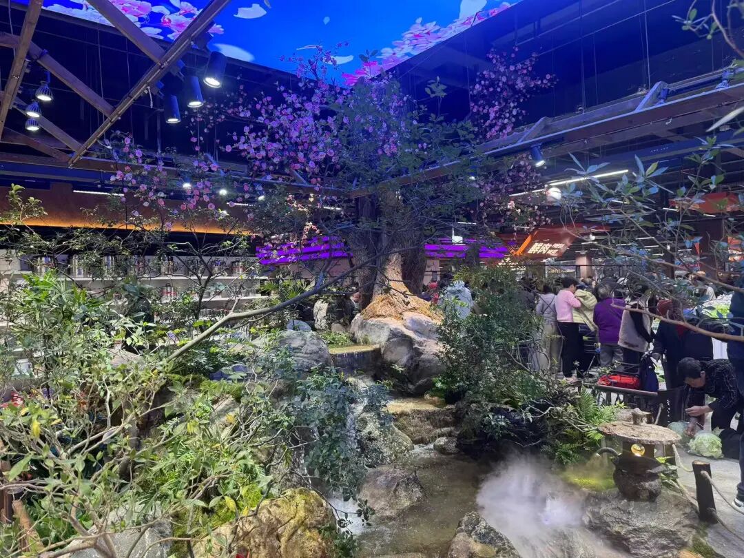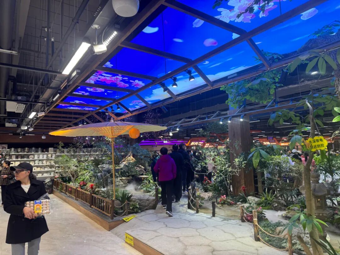“浪費面積是肯定的,這一片公園式造景我們就用了200平左右,不光是面積浪費,背后是成本的上升和費用的增高。同時他還會像一個屏障一樣,隔住了生鮮區(qū)和百貨區(qū),整個動線也會受影響!眲⒚鬈娐员砜上У南蛭覀冋f道。