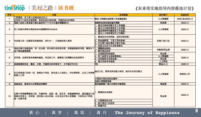 除了現(xiàn)場(chǎng)指導(dǎo)并已完成的工作,對(duì)于不能馬上完成的,我們也制定了計(jì)劃。比如東來(lái)哥要求我們正常發(fā)薪日應(yīng)在5號(hào)到8號(hào),而我們?cè)瓉?lái)是18號(hào)到20號(hào),間隔很長(zhǎng)。東來(lái)哥走之后,我們馬上調(diào)整,現(xiàn)在全店都在5號(hào)到8號(hào)之間發(fā)工資了。漲工資的事也是馬上落實(shí)的,包括優(yōu)化商品等。