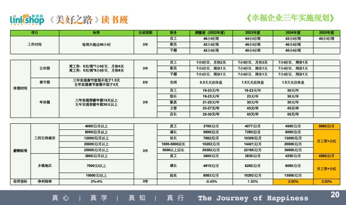 雖然他們現(xiàn)在可能已經(jīng)知足了,但我覺(jué)得距離“優(yōu)秀企業(yè)”還有差距,該做的還是要做。一定要像東來(lái)哥說(shuō)的一樣,朝著卓越企業(yè)(基本工資6000-8000)努力。將來(lái)掙錢了,要拿出50%的利潤(rùn)給員工分成;如果效益更好,可以拿出80%分給員工。我們要真正幸福團(tuán)隊(duì),學(xué)習(xí)胖東來(lái)就要實(shí)打?qū)嵉貙W(xué),是真心真學(xué)、真知真行,用到行動(dòng)上,而不是停留在嘴上。我們要做行動(dòng)的巨人,語(yǔ)言的矮子。這三年半我們一直在持續(xù)前行,參照聯(lián)商網(wǎng)的幸福企業(yè)對(duì)齊計(jì)劃等,一直在做。