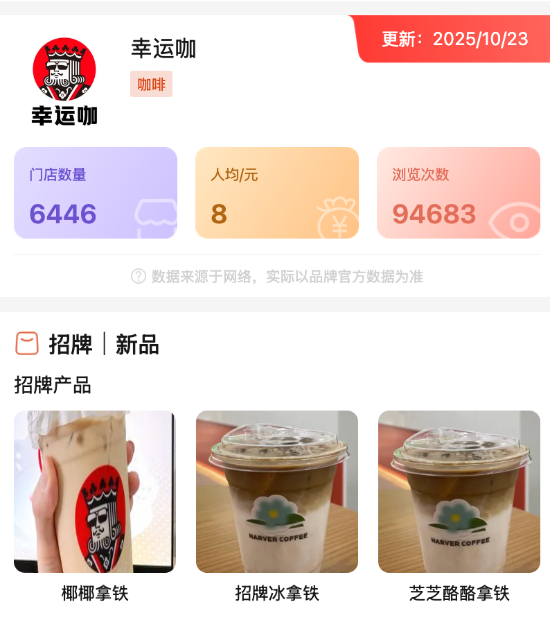 在下沉市場(chǎng),蜜雪冰城旗下的幸運(yùn)咖,則憑借5-8元價(jià)格帶快速擴(kuò)張,有哥餐鏈數(shù)據(jù)顯示,截至2025年11月23日,門店數(shù)為6446家。