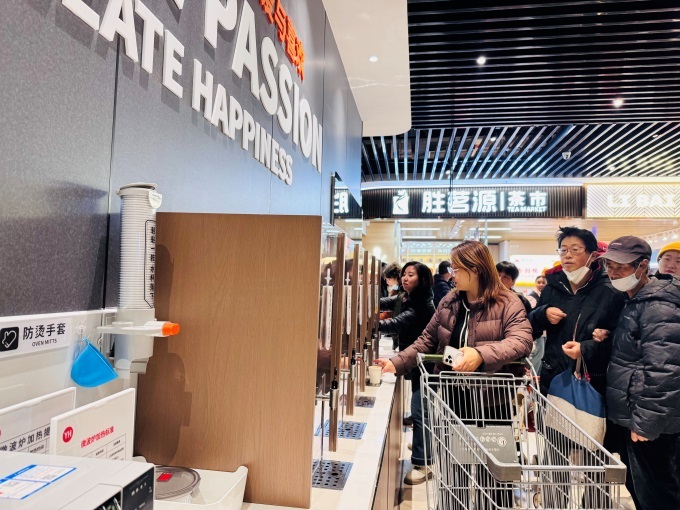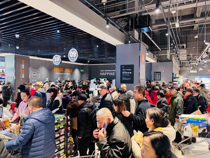 天津熙悅匯購(gòu)物中心店在環(huán)境與服務(wù)層面進(jìn)行了系統(tǒng)性革新。賣場(chǎng)取消了強(qiáng)制動(dòng)線設(shè)計(jì),主通道大幅拓寬,貨架高度統(tǒng)一調(diào)整為1.6米,層數(shù)精簡(jiǎn)至5-6層,營(yíng)造出開闊通透的購(gòu)物空間,加上豐富的試吃,為消費(fèi)者提供“邊吃邊逛”的舒適體驗(yàn)。