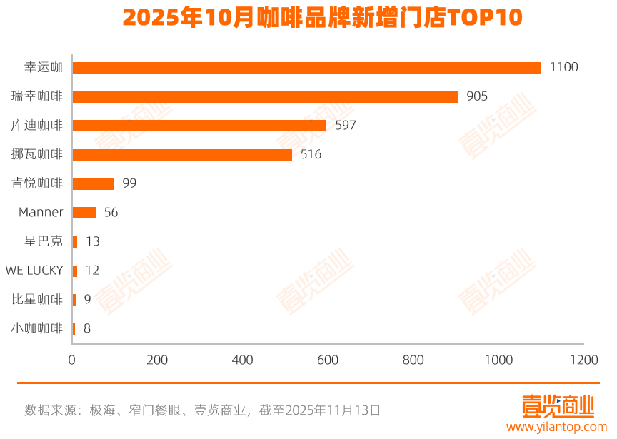 從新開門店看,幸運(yùn)咖、瑞幸、庫迪和挪瓦咖啡四家品牌合計(jì)貢獻(xiàn)了93.09%的新增門店。其中,幸運(yùn)咖單月新增1100家,占比超過三分之一,成為當(dāng)月拓店主力。瑞幸咖啡緊隨其后,單月新增905家;庫迪咖啡與NOWWA挪瓦咖啡則分別新增597家和516家。