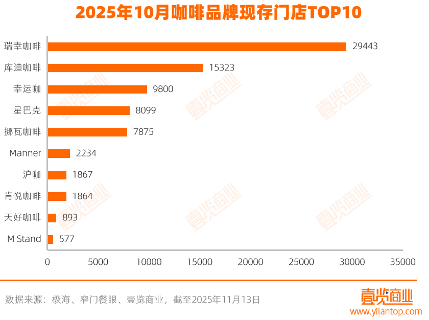 星巴克保持約8000家門店;NOWWA挪瓦咖啡現(xiàn)存7875家,壹覽商業(yè)數(shù)據(jù)顯示,截至2025年11月3日,其寄生店數(shù)量達(dá)7235家,占該品牌全國門店總數(shù)的91.9%。除Manner、滬咖及肯悅咖啡維持在2千店上下水平,其余品牌門店數(shù)量均未超過1000家。