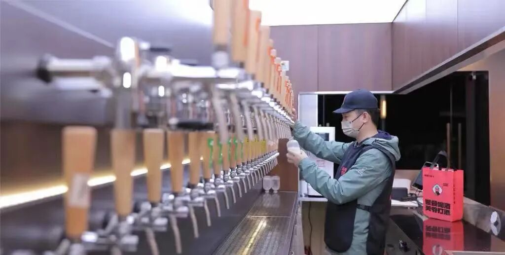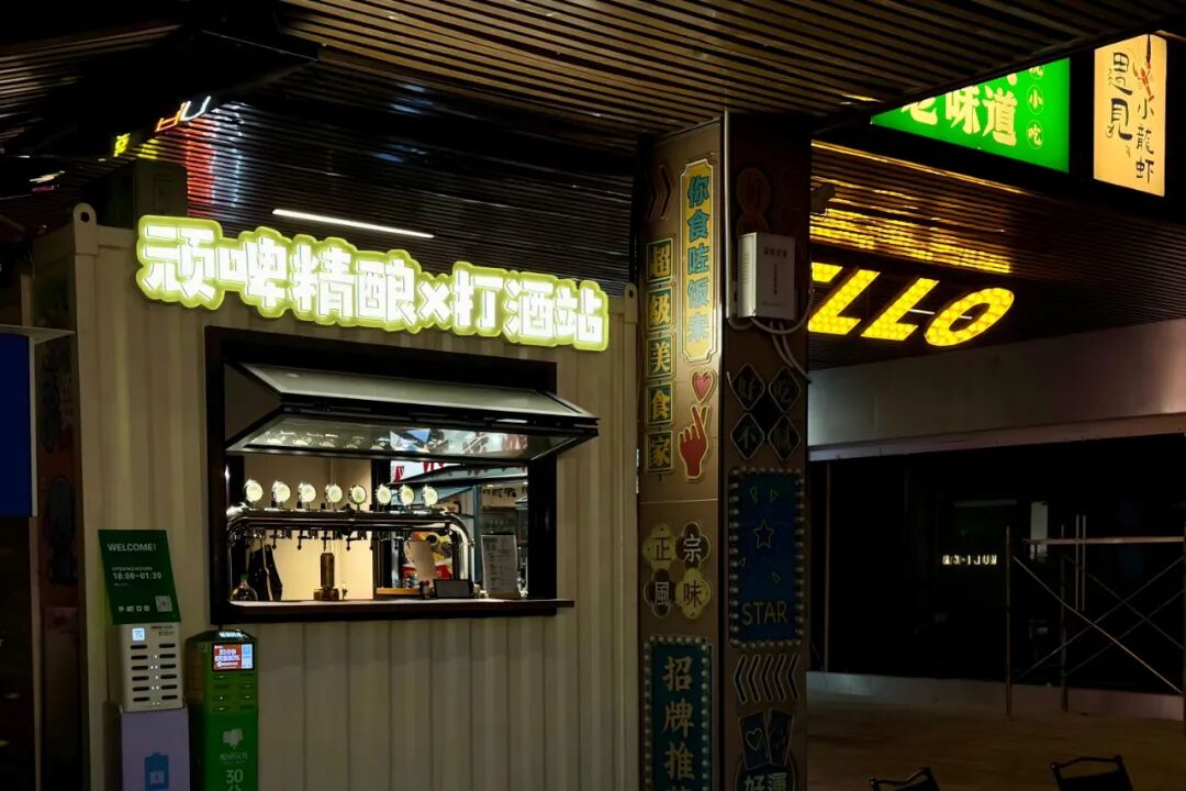 在燈光明亮、裝修簡(jiǎn)約的打酒鋪內(nèi),店員站在一排金屬酒頭前,熟練地為客人打上一杯按“兩”售賣的鮮啤、果酒或白酒。沒有最低消費(fèi),也沒有酒吧震耳的音樂,顧客通常即打即走,或者和朋友在吧臺(tái)邊小坐片刻,配上一把花生米或從隔壁小店買來(lái)的鹵味小吃,享受一段微醺“時(shí)刻”。