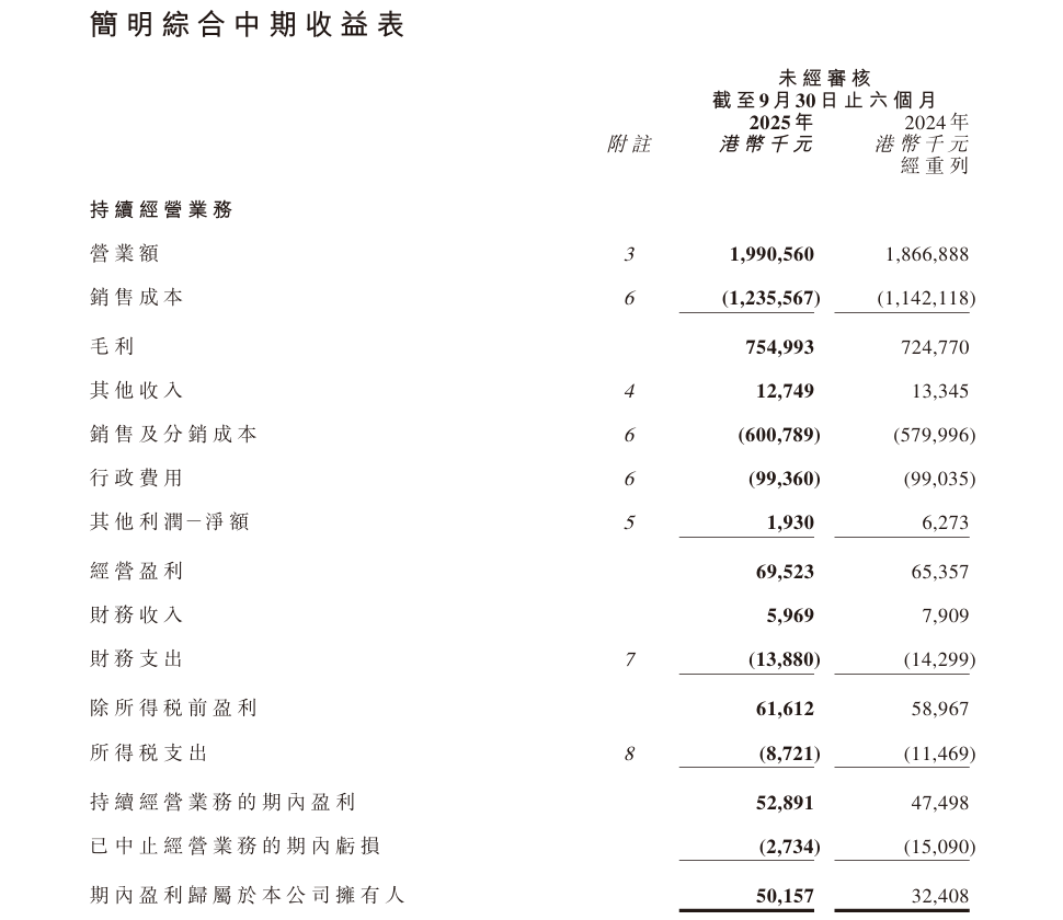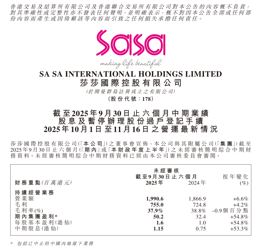 時隔5個月(11月20日),莎莎國際發(fā)布了2025年中期業(yè)績(2025年4月1日-9月30日),值得注意的是,財報顯示,莎莎國際營業(yè)額提升,加上中國內(nèi)地業(yè)務(wù)策略收效,帶動中國內(nèi)地業(yè)務(wù)成功扭虧為盈,期內(nèi)莎莎國際盈利按年上升54.8%至0.502億港元(約合人民幣0.46億元)。