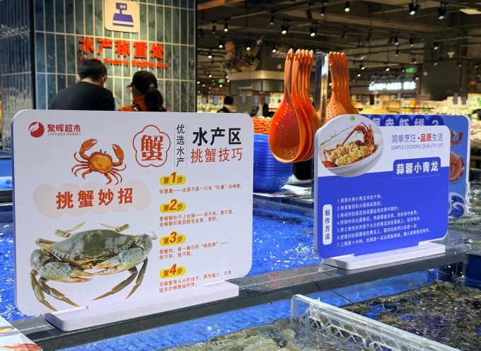 在顧客服務(wù)方面,門店的服務(wù)細(xì)節(jié)亦盡顯匠心。水產(chǎn)區(qū)現(xiàn)撈瀝水、包裝袋除皮;服務(wù)臺配備一次性餐具和醫(yī)藥箱;連卷袋旁設(shè)有濕手器與防扎手套,處處可見對顧客體驗的細(xì)致關(guān)照。店內(nèi)還有商品介紹、挑選技巧、烹飪菜單等一系列的主題卡片和溫馨提示,為顧客提供極大便利。