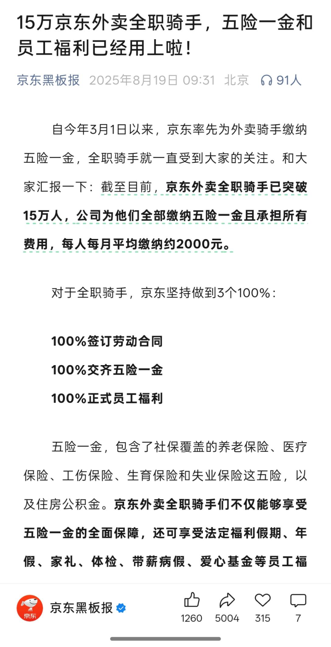 8月,京東官方宣布,公司已經為15萬全職騎手繳納五險一金且承擔所有費用,每人每月平均繳納約2000元。