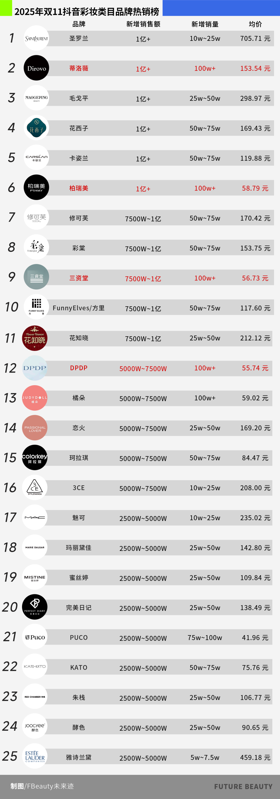 另外在剛剛落幕的2025年雙11大促中,其再次以7500萬至1億元的新增銷售額、超過100萬件的銷量,位列抖音彩妝類目第九名?v觀全年,其今年前10個月在淘天、抖音、京東三大平臺總銷售額已突破9億元,預(yù)計將成為又一個“10億級美妝品牌”。